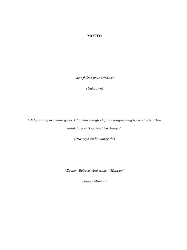 Motto sama dengan kata semboyan. "jika seseorang bepergian dengan tujuan untuk mencari ilmu, maka allah swt akan menjadikan . Selain itu juga ada hadist atau sunah di cantumkan dalam motto skripsi. Motto skripsi yang baik yaitu sesuai dengan judul skripsi. Sedang terpuruk dan ingin mengembalikan semangat yang redup?